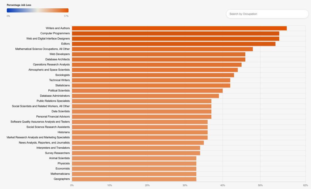 其中,跨越100万名躬行从事AI研发、构建的从业者,自己的岗亭替代率果然也高达26%到55%。