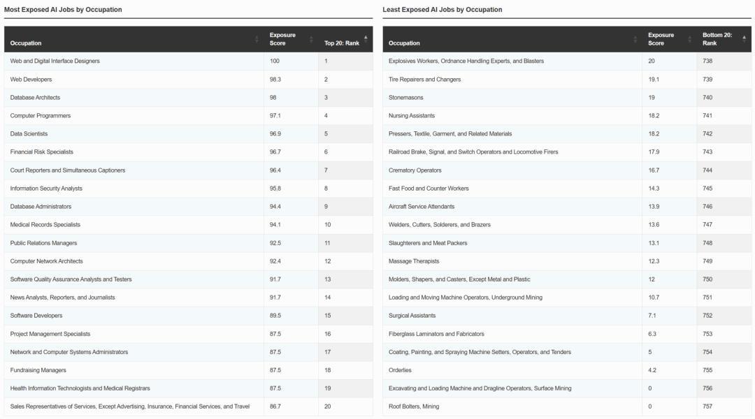 按AI岗亭走漏经过的功绩名次:受AI影响最大与最小的功绩。(图片来源:Digital Planet)