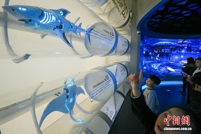1月30日,旅客在位于天津滨海新区的国度海洋博物馆“将来海洋”展厅参不雅多样海洋仿盼望器东说念主。中新社记者 佟郁 摄