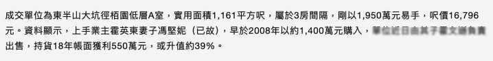 2025年8月,霍英东的二房冯坚妮升天了,她活了96岁,家里没随即对外说这件事,比及半年后,她男儿霍文逊在2026年2月卖掉了她在东半山大坑径栢的一套屋子,这套屋子是2008年买的,其时花了1400万港元,实用面积有1161泛泛尺,楼龄54年,是1972年建的老楼,终末卖了1950万港元,账面上赚了550万,但算上通货扩张、印花税和这些年房价的波动,本体笔直的钱莫得些许。