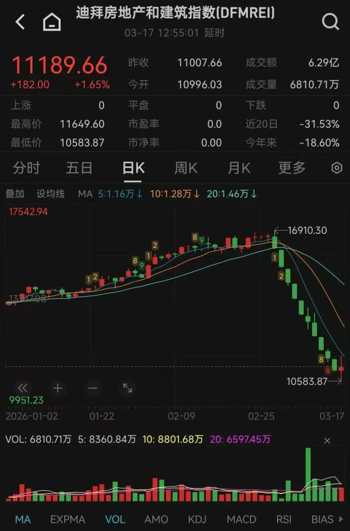 据Wind数据,迪拜房地产和建筑指数(DFMREI)自2月下旬以来出现显著下降,近20日跌幅卓绝30%。