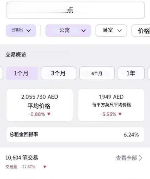 但每经记者从阿联酋头部房产数据与市集谍报平台propertymonitor获得的数据自满,迪拜曩昔一个月(2月16日—3月17日)公寓的成交笔数为10604笔,博亚体育app官网入口同比下滑22.67%。公寓的平均价钱为2055730AED(阿联酋迪拉姆,下同)/套(约合东说念主民币385.6万元/套),同比下降0.88%;每平方英尺平均价钱为1949AED(约合东说念主民币3.94万元/平方米),同比下滑3.53%。