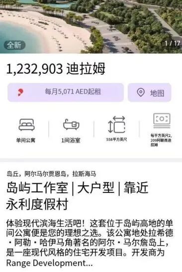 其中一套位于阿联酋拉斯海马约558平方英尺(约51.84平方米)的单间公寓,售价约1232903迪拉姆(约231.27万元东说念主民币),折合国内单价约4.46万元/平方米。